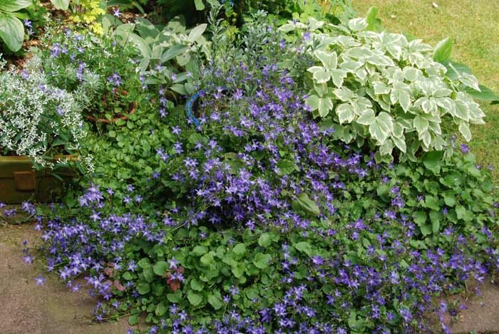 Campanula poscharskyana hat sich in den Terrassenfugen angesiedelt. während Euphorbia ´Diamond Frost´ und panaschierter Giersch (wie ist bloß der lateinische Name