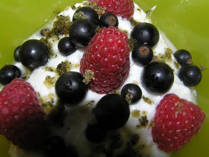 zum nachtisch joghurt mit beeren und minzzucker. er fands furchtbar und meinte es würde wie zahnarzt und medizin schmecken
