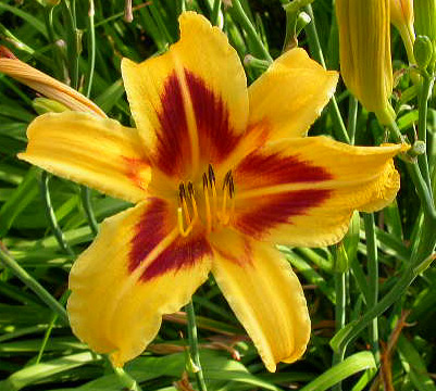 Und dann diese hier, ein Massenblüher mit eleganten Blüten weit über dem Laub. Ich hatte sie letztes Jahr schon mal gezeigt, aber da war das Foto grottenschlecht und ein Tipp schwierig. Daher noch ein Anlauf. Ist es Wideyed? (hmm, Callis, kannst du es eventuell bestätigen?)