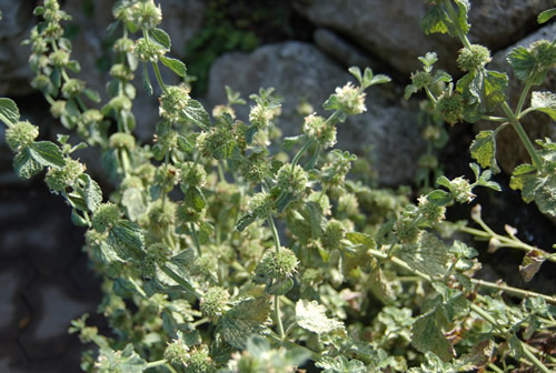 , da nicht alles gleich am Wegrand wächst.Zuerst ist hier eine Pflanze, die zwischen einer Mauerritze hervorwächst, nun zu einem ansehlichem Busch geworden ist und relativ selten vorkommt. Mit seinen silbrig-grauen und etwas filzigen Blättern sieht er auch noch hübsch aus.Marrubium vulgare: