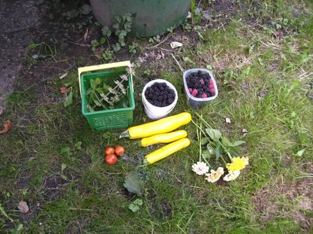 Ich habe am Donnerstag das auf dem Bild geerntet + die ersten Feigen und ein paar Tomätchen hatte meine Tochter schon verspeist.Gestern gab es viele Brombeeren und ca. 3 kg Feigen.