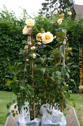 Hurra die climbing"'Lady Hillingdon'aus Lottum blüht bei mir auch gerade und sie ist wirklich wunderschön. Und den passenden Obelisken habe ich auch dafür. Einen alten umgedrehten gusseisernen Kleiderständer an den ich 4 Beine anschweissen liess und vorletzten Sonntag mit grauem Hammerite gestrichen habe!