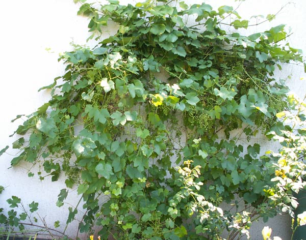 So eine Sortenbestimmung ist schwieriger als gedacht! Falls ich nochmal eine Rebe pflanze, wird es auf jeden Fall eine frühreifende und resistente Sorte sein. Die besten Wandseiten sind aber schon vergeben. Links neben meiner geposteten Rebe steht noch eine. Die ist aber erst 2 Jahre alt und noch (!) gesund. Auch hier weiß ich die Sorte nicht, ist aber nicht meine Schuld, meine Mutter hat sie bei einem (eher berüchtigten) Gartenversand bestellt. Sie hat deutlich später geblüht - so 2 Wochen - als die andere und ich fürchte, daß sie nicht ausreift.Deshalb noch eine Frage: Muß man davon ausgehen, daß später blühende Sorten auch später ausreifen?Ein Bild hab ich auch noch, war fotografierwütig heute