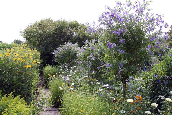 Hier ein blau-gelbes Beet. Im Vordergrund Hochstämmchen von Solanum