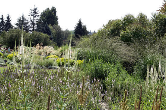 Ein Beet mit zahlreichen Euphorbien und Gräsern. Letztere wiegen sich im Wind. Es weht dort immer eine leichte Brise.