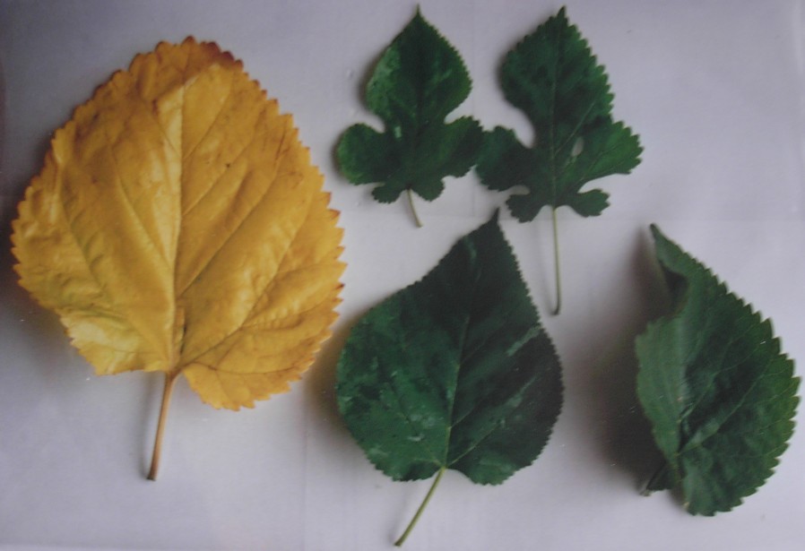 halloauf all den Bildern sind nur Morus alba abgebildet.Es gibt kaum ein Baumschule die wirklich Morus nigra anbietet.Um eine Bestimmung zu erleichtern versuche ich einige Bilder anzufügen.Das Blatt unten rechts ist von altem Morus nigra Cultivar.Die Blätter sind herzförmig, wobei die Batthälften einen stumpfen Winkel bilden - bei alba sind die Blätter flach.Der Stiel ist "versteckt" bei alba länger und gut sichtbar.Da auch Morus alba rauhe Blätter haben können ist dieses Merkmal zur Bestimmung nicht geeignet.