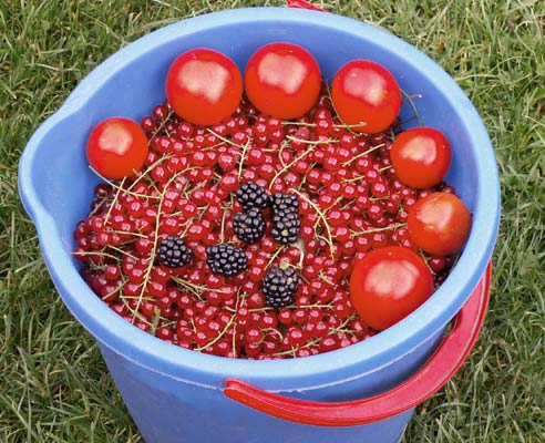 Ich habe heute morgen mal wieder den Kopf in die Johannisbeersträucher gesteckt. Außerdem gab es die tägliche Ration Tomaten und die allerersten Brombeeren in diesem Jahr.Den James Grieve haben wir auch. Unserer ist noch ziemlich grün und noch nicht erntereif.