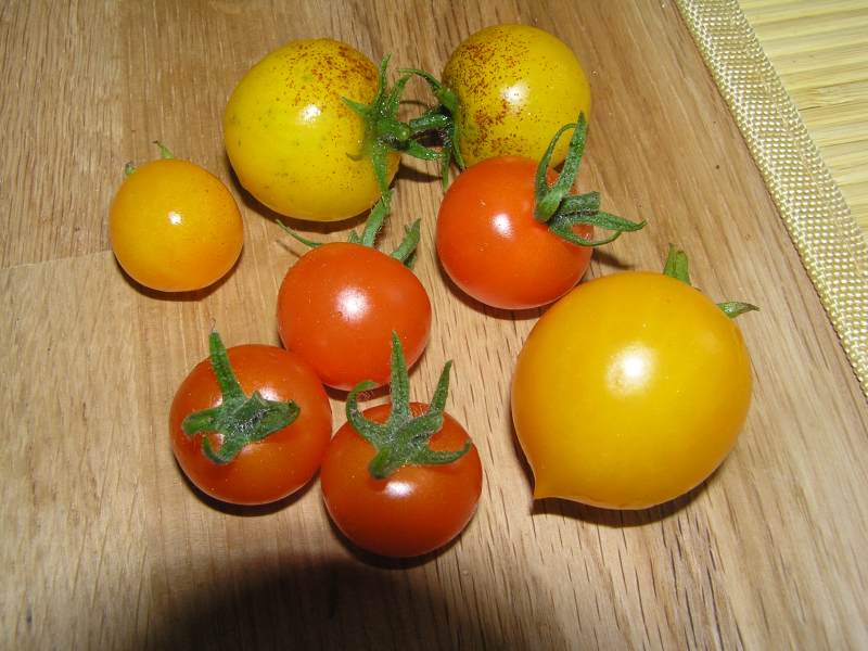 gerade geerntet.sungold und pendulina.die lasse ich nun aber noch 1-2 tage im haus liegen, so verbessern sie nochmal ein wenig ihr aroma, wenn sie schon keine sonne abbekommen. sie sind zwar reif, aber durch das nasskalte wetter draußen sicherlich noch nicht sonderlich aromatisch-süß.