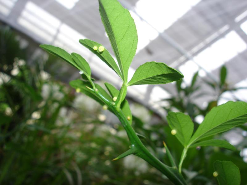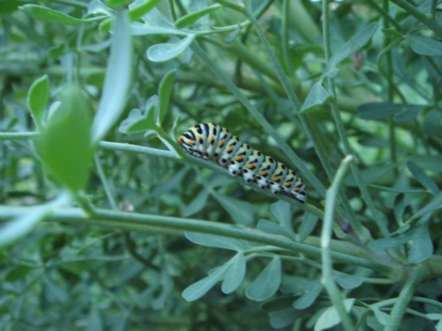 Und hier die Nummer drei. Das ist noch ein kleiner. Die beiden letzten sitzen derzeit recht geschützt, man sieht sie nur, wenn man sucht.Ich erwäge folgendes: Nummer 1, die fetteste, in Schutzhaft nehmen. Ich habe auch ein paar getopfte Weinrauten, könnte sie also samt Futterpflanze einsperren. Vielleicht an einen geschützen Platz und so eine Plastik-Pflanzenschutzhaube drüber, oben ein klein wenig offen zwegen Luft? Oder wird es da auch wenn man sie ganz schattig stellt, zu warm drunter? Was meint ihr?