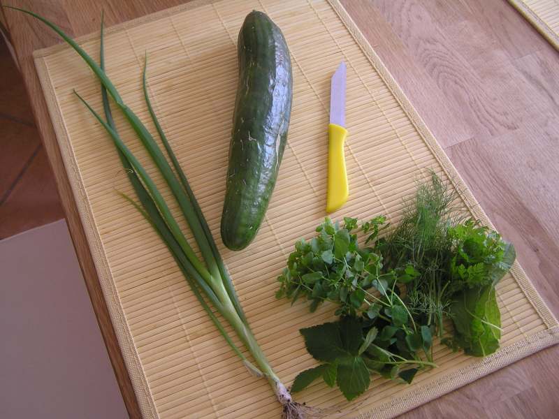 heute: die erste gurke! (leider aus einer gekauften pflanze..meine eigenen sind noch nicht soweit)dazu gleich die passende hand voll kräuter für den gurkensalat.