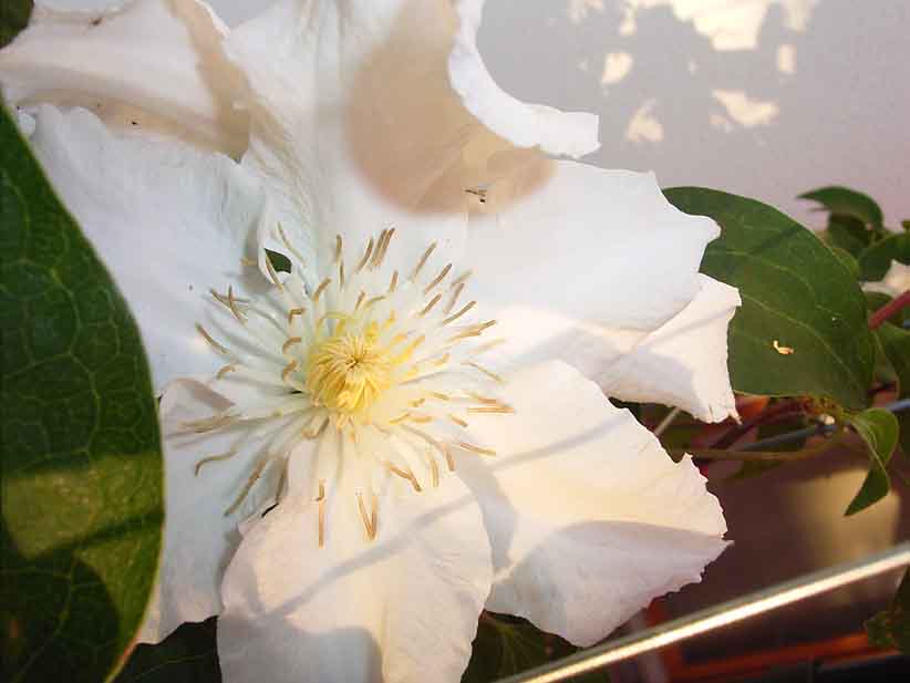 Ich find's toll, daß meine vor wenigen Monaten gesetzte C. Saalomon schon so schön blüht.Das Bild hab ich in der Dämmerung mit Blitz gemacht, der auf dem Metallgitter reflektiert hat, deshalb fällt das Gitter auf dem Bild etwas unschön auf, in echt leuchtet aber die Clematis allein durch die Dämmerung.