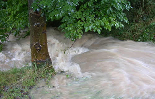 Neoprenanzug hätten wir hier auch brauchen können. In genau 24 Stunden kamen 90 lt runter. Eigentlich wollte ich je heute morgen die regenfesten Rosen fotografieren. Aber das rauschen des Baches ein Haus weiter liess mich Stiefel, Hut und Regenjacke schnappen. Der Dorfbach, meistens ein braves Bächlein 1,5 m breit und mit 10 cm Wasser, gerade richtig für ein Hundefussbad in der heissen Sommersonne, war heute geschwollen. Mächtig drängt es ihn über den Rand des Ufers in Richtung auf der anderen Seite der Strasse stehende Liegenschaft und in einen Baumgarten. Noch knapp 10 cm mehr und die Ueberflutung wäre komplet gewesen. So blieb es mehrheitlich bei überfluteten Gärten. Rundherum war es aber sehr viel schlimmer. Die Aare und grössere Bäche richteten immensen Schaden an.