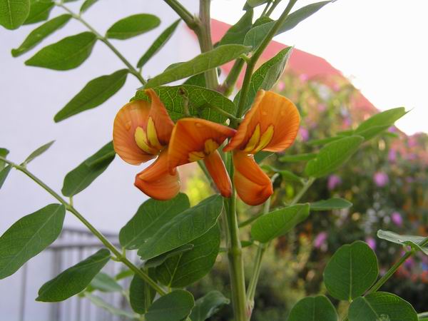 Colutea arborescens, letztes Frühjahr aus Samen selbst gezogen 8)Er hat orange statt der üblichen gelben Blüten, sie sehen aus wie kleine Masken.