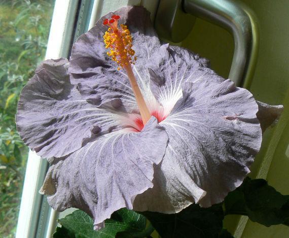 Jetzt muss ich Euch auch eine Blüte zeigen. Ich habe die Pflanze von einem lieben Puristen bekommen, sie zeichnet sich durch eine gewisse Zickigkeit aus: während der 0-8-15 rotblühende Hibiscus am selben Standort Blüte um Blüte schiebt, wächst bei diesem immer mal wieder eine einzige - gaaanz langsam. Aber dann öffnet sich eines Morgens ein großer Teller in einer wunderbar morbiden Farbe