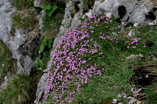 Dann sind wir wieder raus aus der Schlucht und hinauf ins Schotterkar von vorhin.Ein bisserl was Botanisches: Linaria alpina, mitten im Schutt.