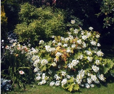 Dann will ich die Hydrangea quercifolia mal mit Blüten versehen ;)So schaut sie gerade in meinem Garten aus.