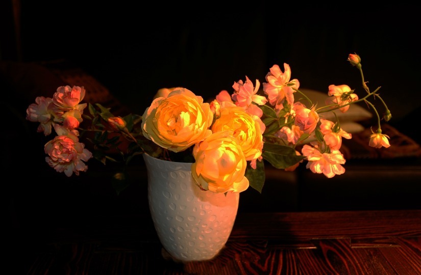 Bevor sich die 3. Blüte der Rosen nach dem heutigen Starkregen in Mumien verwandeln wurden sie für die Vase gerettet und erleuchten den abendlichen Wohnzimmertisch...!