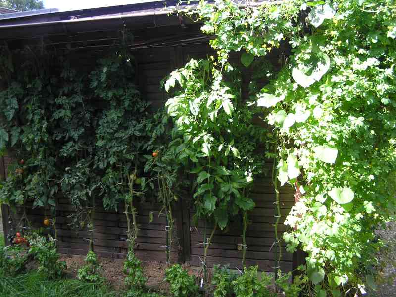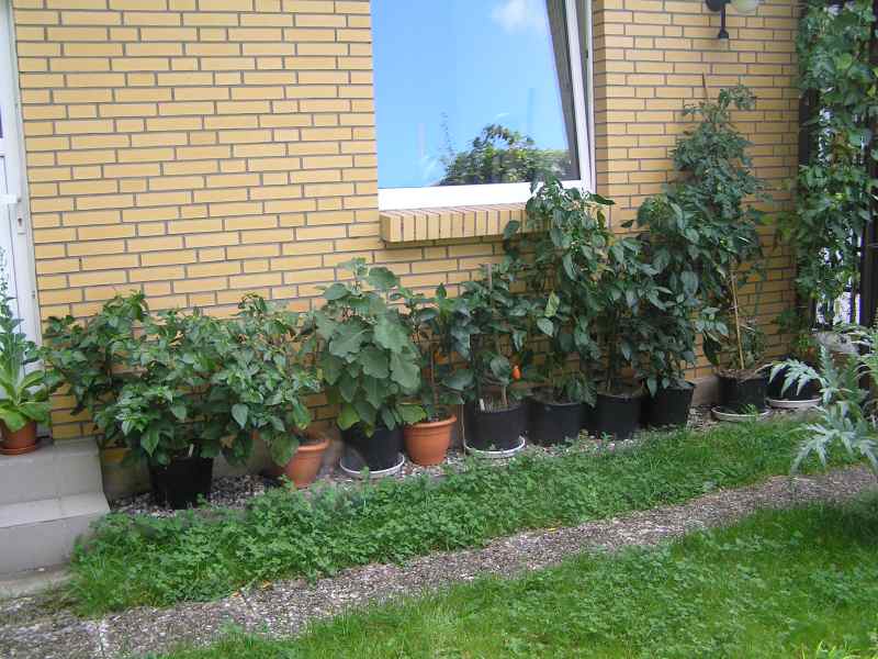 schräg hinterm gemüsebeet, an der hauswand wachsen in kübeln 2 tomatenstöcke, verschiedene paprika, verschiedene chilis und 2 pötte mit auberginen.