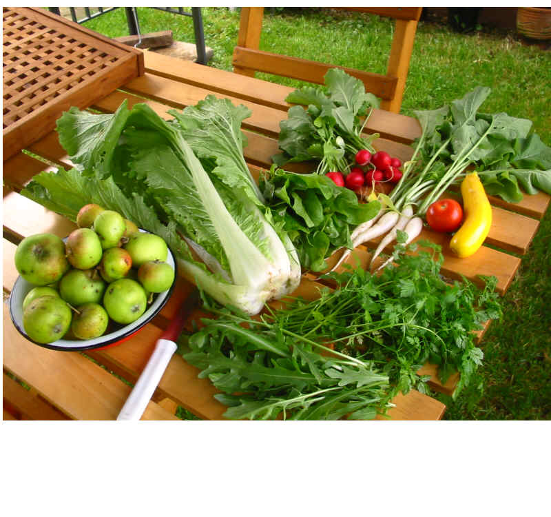 !),eine kleine Zucchini für den Salat, die anderen waren mir zu dick,Radieschen rot,Radieschen Eiszapfen,Wilde Rauke,Kerbel,Spinat,etwas Fallobst,haha, meine erste (unversehrte) Tomate
