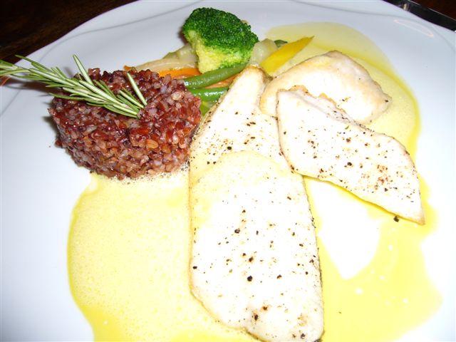 ... danach fangfrischen Fisch aus dem See auf Safransauce, "etwas" Gemüse mit Camarque-Reis