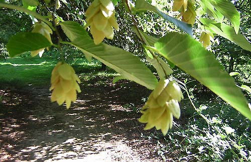und die Hopfenbuche Ostrya carpinifolia traegt schon Fruechte, die auch sehr sehenswert sind. Ist ja auch nicht so alltaeglich. Mir sind die Ostrya als alte Baeume schon oefter aufgefallen, da sie oft so einen knorrigen Stamm und Habitus aufweisen. Fast ein Baum aus Lord of the Rings, koennte man meinen. Aus dem Enchanted Forest eben, wo die Baume umherwandeln.