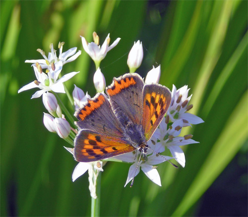 Könnte das ein kleiner Feuerfalter (Lycaena phlaeas) sein?Zum Größenvergleich: sitzt auf der Blüte eines Schnitt-Knoblauchs, Mitte September.Liebe Grüße, Barbara
