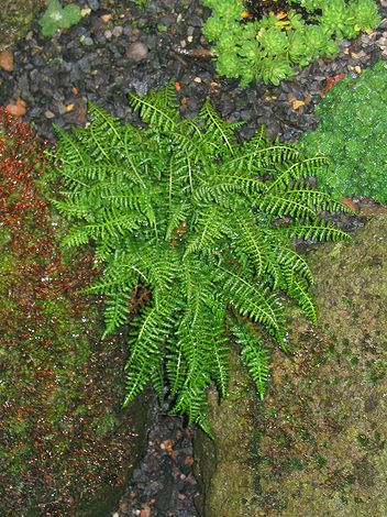 .Polystichum setiferum ´Green Lace´ ist ein Kind des P. ´Bevis´, die Wedel aus grüner Spitze sind besonders edel aber Mama hat die bessere Figur.