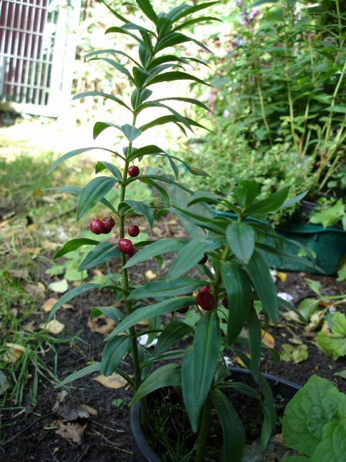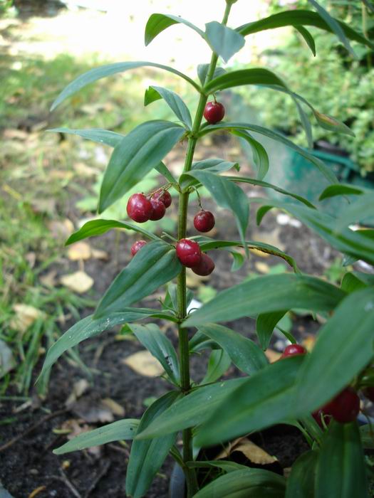 Scheint die gleiche Art zu sein, die ich als P. roseum bekommen habe. Und die Früchte werden dann mit der Reife genauso rot, wie beim heimischen P. verticillatum, wenn ich mich richtig erinnere. (hat dies Jahr keine Früchte angesetzt). Insgesamt wurde sie bisher nicht höher als 35 cm....meine Pflanze hat weitgehend quirlständige relativ kleine dunkelgrüne Blätter. Aus den "Quirlachseln" (??) hängen die kurzgestielten grünen Samenbeeren (oder was auch immer das botanisch korrekt ist).
