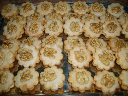 Ich mag gerne Walnussmakronen. Die mach ich nach dem Makronen-Grundrezept (4 Eiweiß schaumig schlagen und ... g (200?) Nüsse, bzw. Kokosflocken drunterheben). Die Hälfte der Walnüsse wird gemahlen, der Rest grob gehackt, und es kommen noch kleingeschnittene getrocknete Mirabellen (besser, aber nicht selbstgemacht verfügbar: Aprikosen), eingeweicht in Orangenlikör hinein.