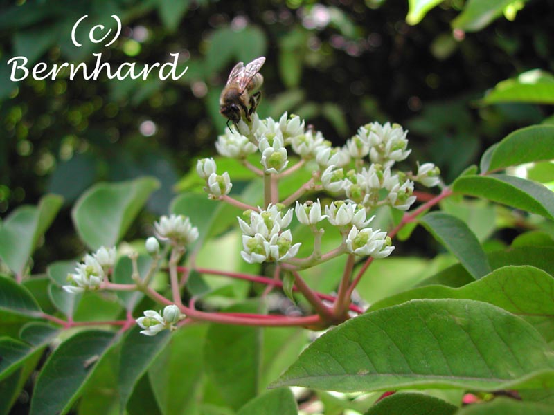Bei mir jetzt blühend Tetradium danielli (= Euodia hupehensis), die Stinkesche. Mit am Bild zu sehen, eine Vertreterin eines Volkes, die diesen Baum ebenso schätzt wie ich!