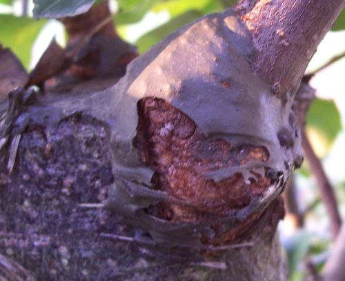 ja Baumkrebs war auch meine erste Vermutung kam sicher durch die Wunden rein oder war schon am Mutterbaum der Reiserhttp://de.wikipedia.org/wiki/Baumkrebs