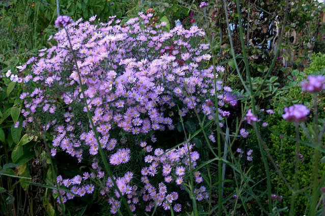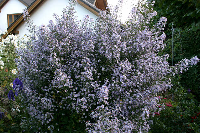 Auf einer Größe von über 170 cm blüht schon seit 1-2 Wochen die ScheinasterBoltonia asteroides "Snowbank" im Beethintergrund