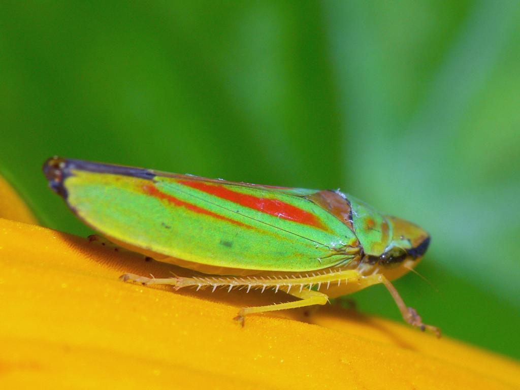 Das ist eine Rhododendron-Zikade(Graphocephala fennahi) auf Abwegen.(auf einem Sonnenhut)LG KohakuWer ist denn das?
