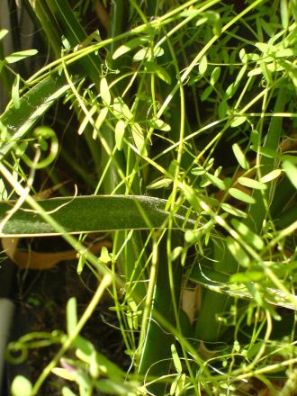 :DAnscheinend hat sich beim Umtopfen noch etwas in den Topf geschlichen, und ich habe mal wieder keine Ahnung, was es sein koennte. Kann mir jemand von Euch sagen, was da meiner A. filifera Mut beim Wachsen macht?Viele liebe Gruesse vom unbekannt-umschlungenen11vonZwerg