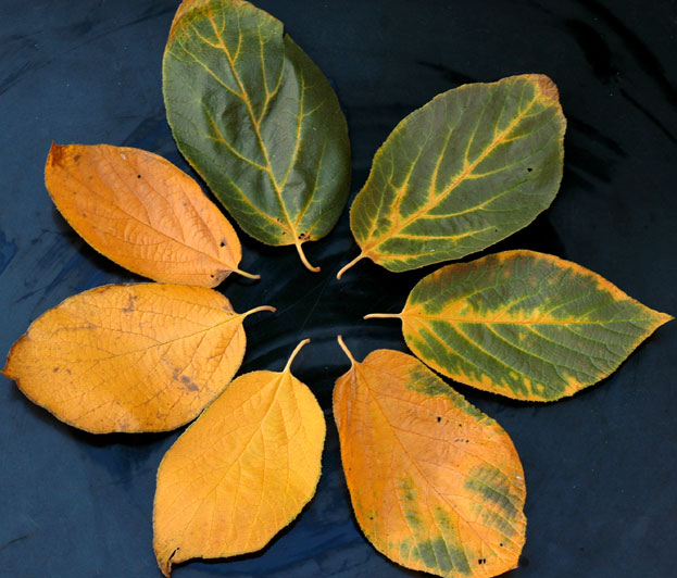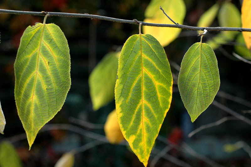 Die Herbstfärbung ist ein warmes Orange. Die Färbung beginnt dezent in den Adern und ergreift von da aus nach und nach das ganze Blatt.