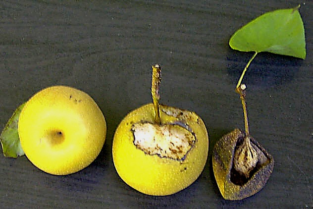 Meine Nashi 'Kuomi' ist etwa 7 m hoch und trägt regelmäßig zahlreiche Früchte, die sehr gut schmecken, dabei aber weder an Apfel- noch an Birnen erinnern. Auch die großen Blüten sind sehr attraktiv.Leider werden die Früchte bei mir regelmäßig von Hornissen befallen, die zuletzt nur die Schale und das Kerngehäuse übriglassen (siehe Bild). Man selbst kann sich dem Baum wegen des drohenden Brummens der zahlreichen Hornissen meist nicht nähern.