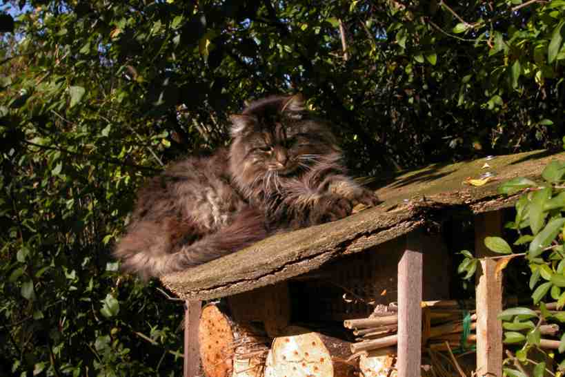 Flokati genoss gestern die Sonne auf dem Dach des Insektenhotels.Allerdings brachten ihn immer wieder herunterfallende Blättchen aus der Ruhe