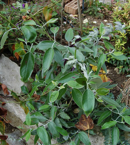 Die peruanische Salbei mit dunkelvioletten, fast schwarzen Blüten. Die Salbei ist sehr klebrig und muss auch rein im Winter. Da sie anfänglich etwas Mühe hat sich anzuklimatisieren, sich nun aber prächtig erholte, zeigt sie nun etwas weniger Blüten.