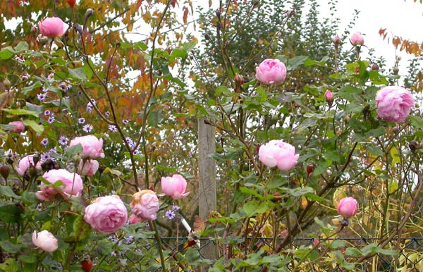 Wir hatten schon frostige Nächte, die Bohnen hat's erwischt, auch die Fuchsien, aber die Rosen halten wacker durch. Hier blühen außer den beiden oben noch fast alle Strauchrosen. Trier ist die wildeste, die hat alles voll Knospen.