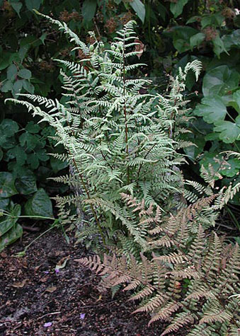 Dieser Farn ist eine Hybride zwischen Athyrium filix-femina und A. niponicum 'Pictum' mit dem Namen Athyrium x Ghost.