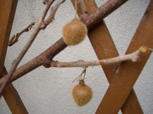 die früchte meiner a.deliciosa- sorte "hayward" hängen noch am strauch. vor dem ersten scharfen frost werden sie geerntet, sind aber auch dann noch nicht reif. sie kommen in den keller auf eine apfelhorde und sind etwa ab weihnacht genußreif.