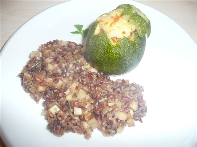 heute gab es:bunter MangoldsalatRondini gefüllt, dazu Gedreiderisotto mit Linsen und Topinamburwürfelchen