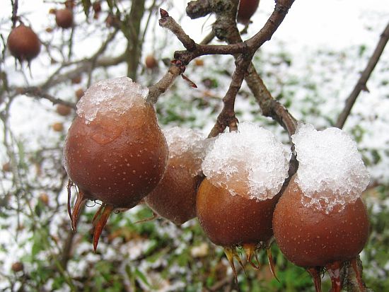 . Und auf den Bildern sieht man sehr schön, dass es selbst in Berlin schneien kann, wenn auch zum Glück nicht solche Mengen wie in Österreich.Soweit ich gelesen habe, hat man in Nordamerika die Osagedornfrüchte tatsächlich gegessen. Ehrlich gesagt, das helle Grün wirkte irgendwie giftig auf mich und ich glaube beinah nicht, dass ich die Dinger mal probieren möchte.Erstaunlicherweise war der GG den Mispeln gar nicht abgeneigt.Viele Grüße,Dicentra