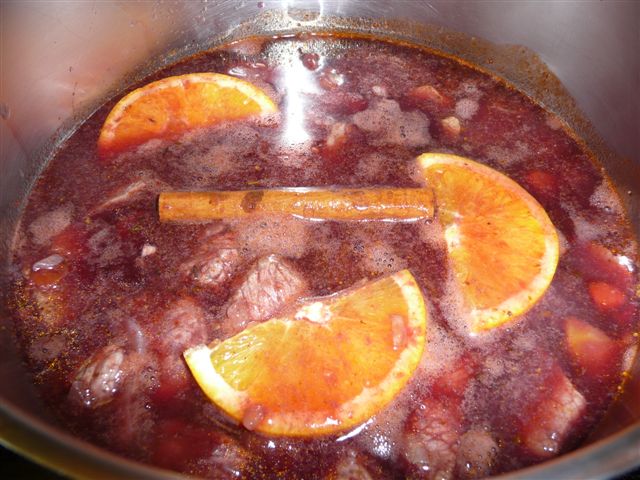 Heute gab es:Rindsragout an einer Orangen-Schokoladensauce... hier noch im Topf