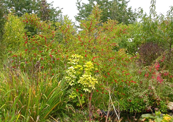 Ilex verticillata will auch nicht unbedingt in die "Ilexecke". Er ist in nordamerikanischen Feuchtgebieten beheimatet und hat gernen einen etwas morastigen, sonnigen Platz.Außerdem sieht er gar nicht aus wie ein Ilex. Er hat weiche, ganzrandige sattgrüne Blätter, auf dem Bild sind sie etwas zu gelblich geraten. Er ist auch nicht immergrün, zur Zeit ist er kahl - alle Blätter sind abgefallen und die Beeren haben sich die Vögel geholt.