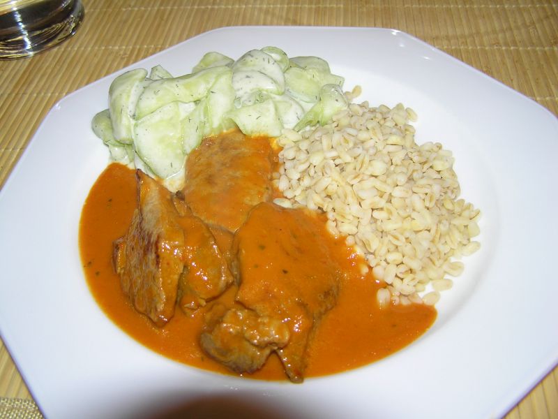 hier gabs gerade den rest vom (eingefrorenen) raclettefleisch in einer scharfen paprikasoße, dazu ebly und gurkensalat.