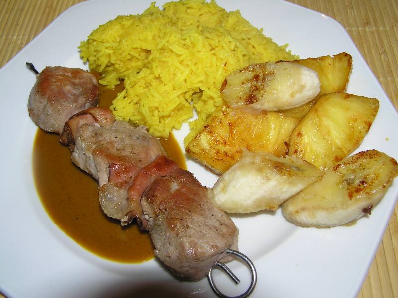 danach:Fleisch-Spiesschen, mit Curryreis, gebratener Ananas und Banane