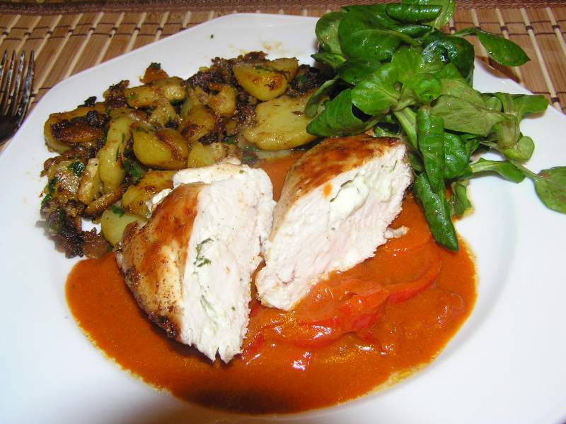 ) mit angemachtem frischkäse gefüllte hähnchenbrustfilets auf paprikasoße mit paprikastreifen. dazu bratkartoffeln und feldsalat mit rotweindressing.