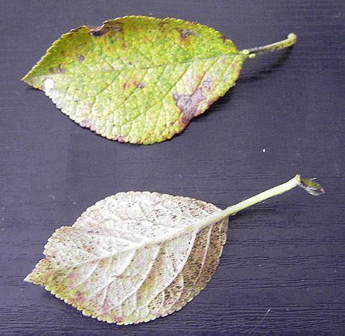 Ich wünschte, ich könnte eine Lupe auf das untere Blatt halten... was sind die rötlichen Flecken (links) und die schwarzen Flecken (mehr rechts)?Wie auch immer, du hast die Wahl zwischen Obstbaumspinnmilbe (Bekämpfung meist unnötig) und Ring- und Bandmosaik-Virus (Bekämpfung mit chemischen Pflanzenschutzmitteln nicht möglich).Das was bleibt ist, für einen guten Allgemeinzustand des Baumes zu sorgen, damit er möglichst solchen, oft wetterbedingten Attacken widerstehen kann. Also große, unverdichtete Baumscheibe (im Frühjahr mit Kompost mulchen), gleichmäßige Feuchtigkeit, lichter Schnitt, zusätzliche Krankheiten und andere Schädlinge im Rahmen der ökologisch vertretbaren Möglichkeiten bekämpfen.