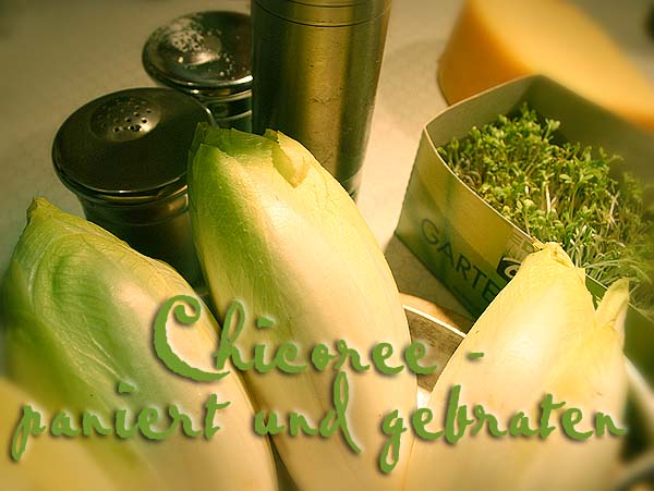 chicoree, paniert und gebratenchicoreegemüsebouillon1 eipaniermehlgewürzebratfett oder ölchicoree in kochender gemüsebouillon blanchieren, herausnehmen, abtropfen lassen (gemüsebrühe heb ich auf für ein feines süppchen)ein ei verquirlen, würzen (salz, pfeffer, kräuter)einen suppenteller mit paniermehl füllennun die chicoree erst im ei wälzen, dann in paniermehl. in die pfanne geben und von beiden seiten braten, bis die panade knusprig braun ist.